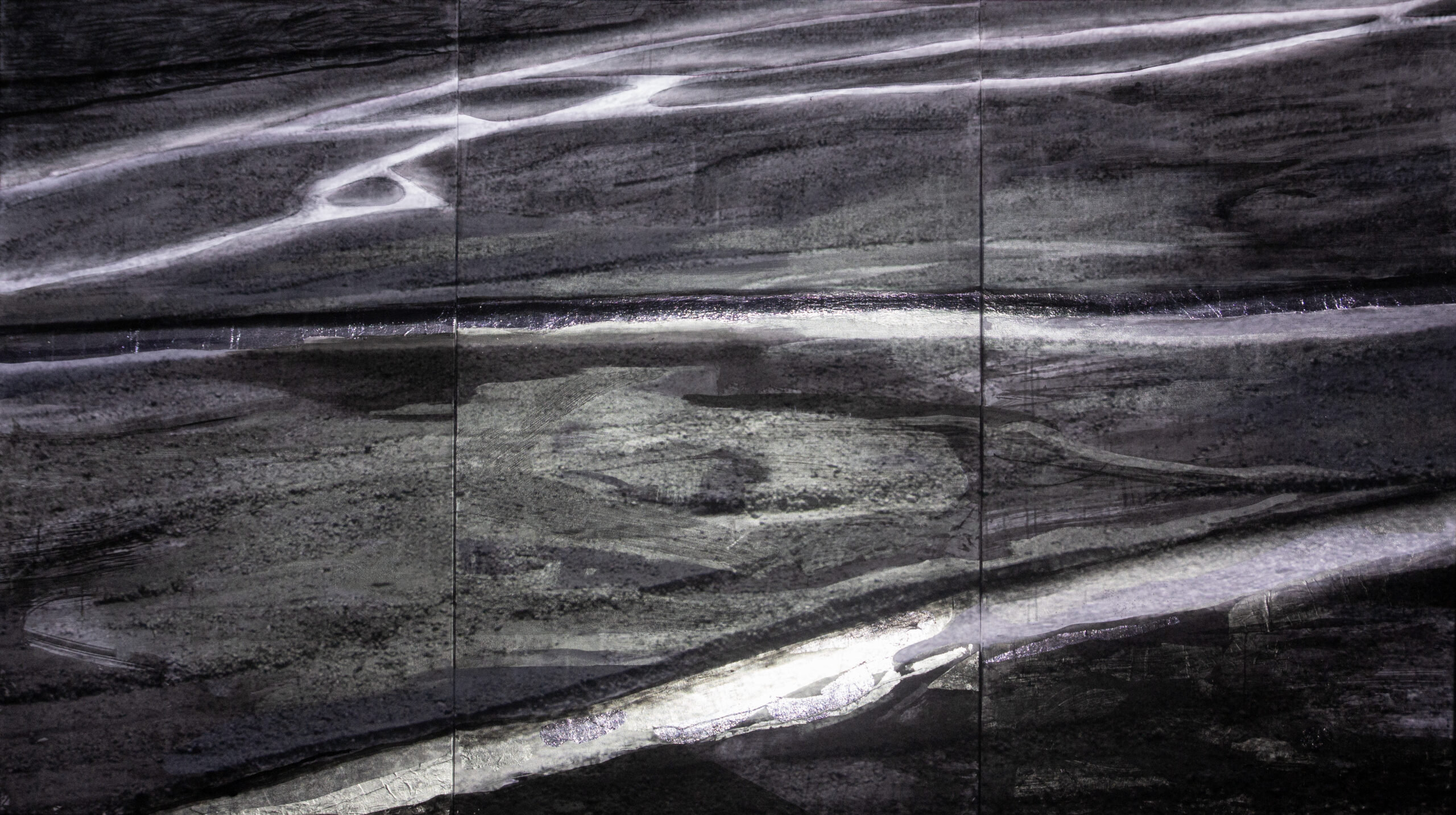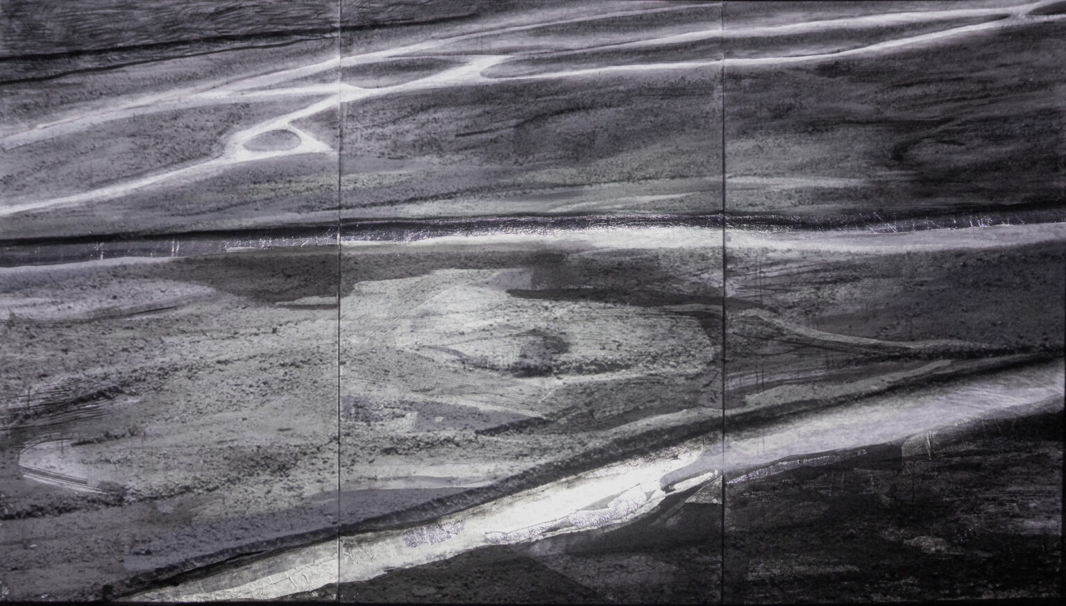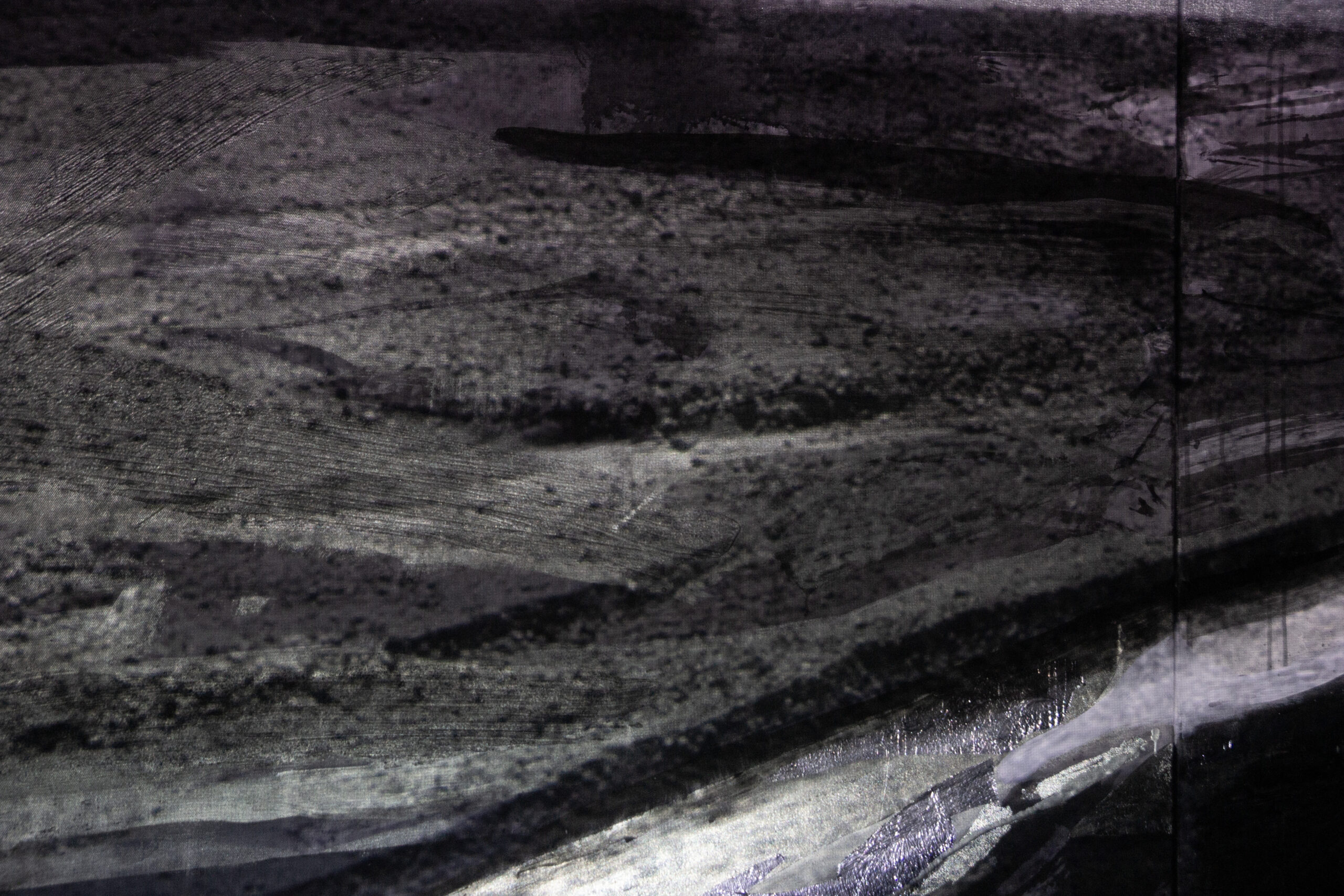 Inspiracją obrazu było wyschnięte koryto rzeki, które sfotografowałam niedaleko położonej wysoko w górach Kaukazu wioski Xınalıq (Azerbejdżan). Fotografia stała się punktem wyjścia do wizualnych rozważań o naturze rzeki, jej zmienności i relacji z otoczeniem.